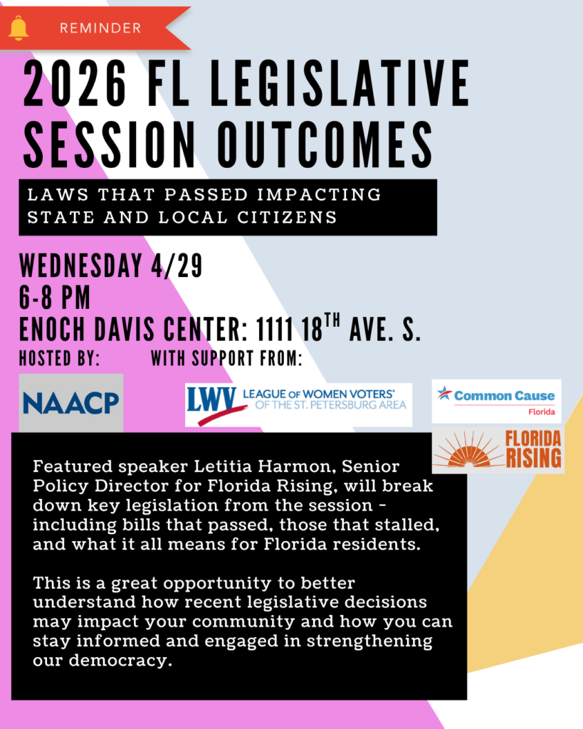 Join the NAACP of St. Petersburg and the League of Women Voters of the St. Petersburg Area to learn about the outcomes of the 2026 Florida Legislative Session.