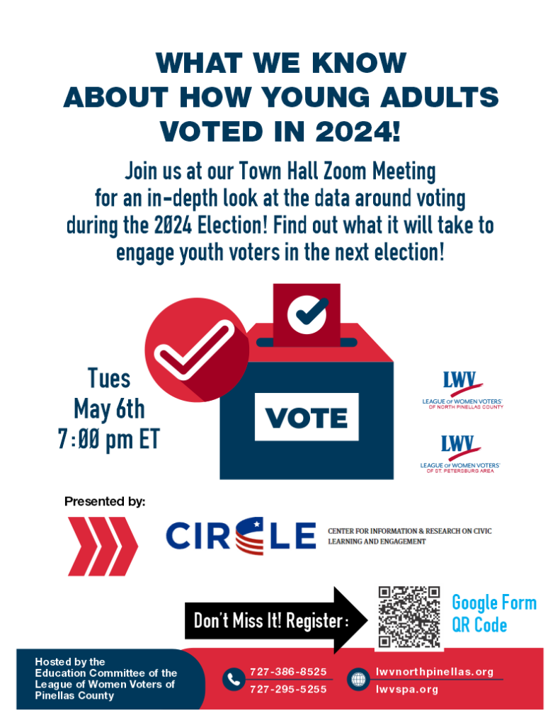 Join us at our town hall zoom meeting for an in-depth look at the data around voting during the 2024 election. Find out what it will take to engage youth voters in the next election! Hosted by the Education Committee of LWVNPC / LWVSPA.